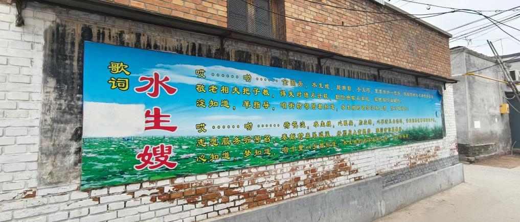在安新县圈头乡西街村的一面墙上,喷涂着歌曲《水生嫂》的歌词。新华社记者苏凯洋摄