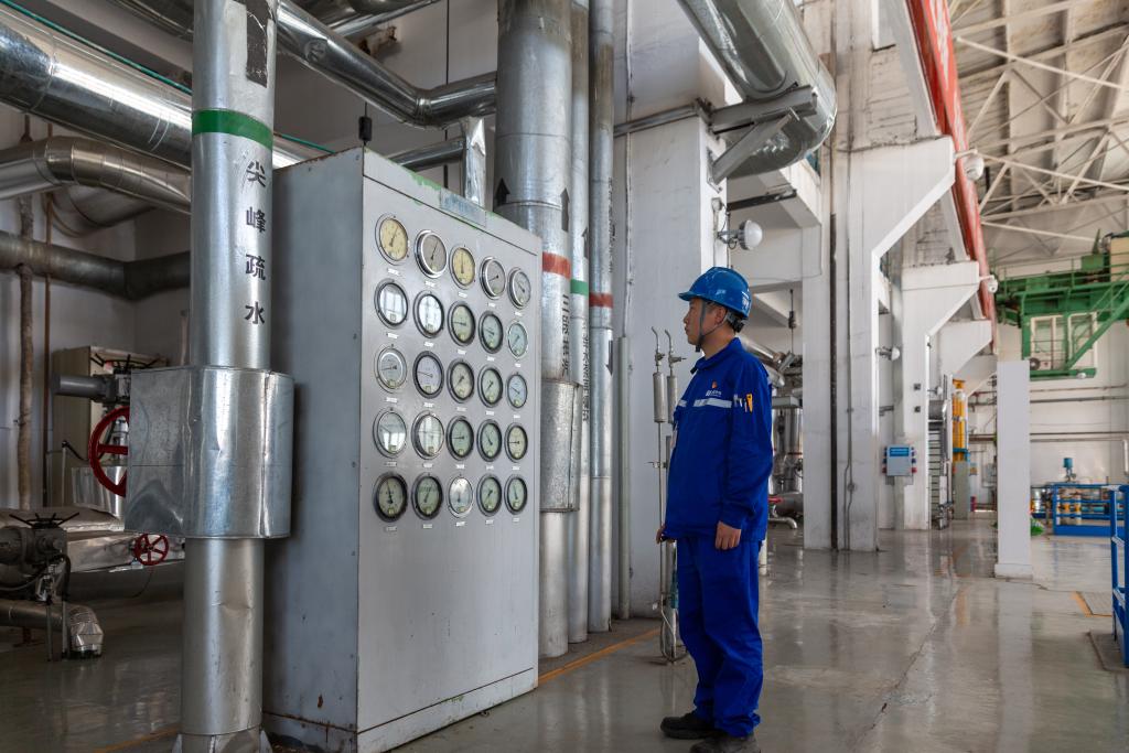 8月31日,根河光明热电有限责任公司工作人员在检查汽轮机压力表盘。新华社发