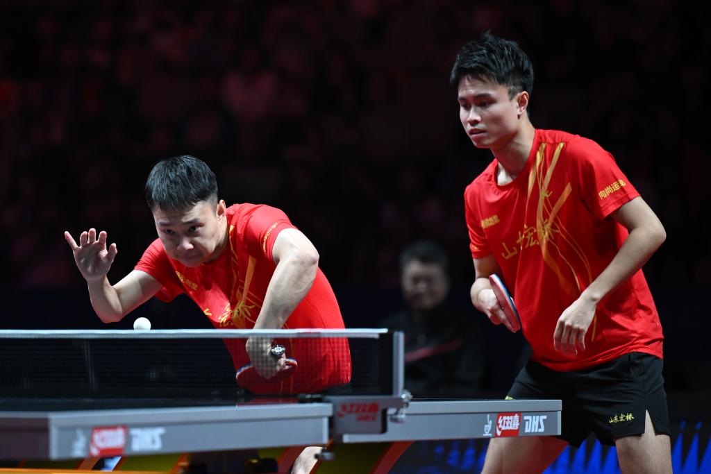 9月1日,山东魏桥·向尚运动队组合于子洋(左)/周启豪在比赛中。新华社记者 丁磊 摄