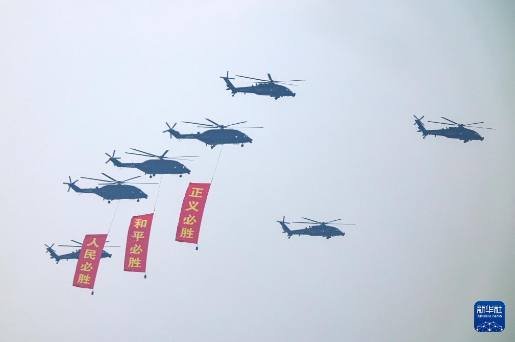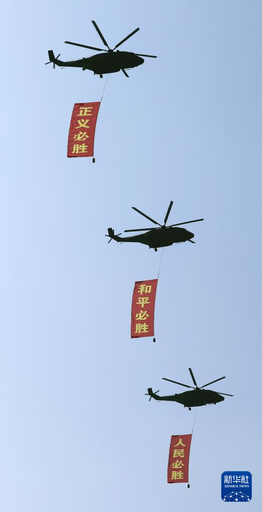 9月3日,纪念中国人民抗日战争暨世界反法西斯战争胜利80周年大会在北京隆重举行。这是空中护旗梯队通过天安门广场,3架直-8L运输直升机分别悬挂“正义必胜”“和平必胜”“人民必胜”条幅。
