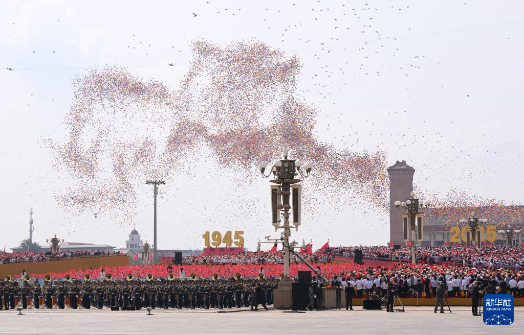 9月3日,纪念中国人民抗日战争暨世界反法西斯战争胜利80周年大会在北京隆重举行。这是纪念大会现场放飞和平鸽和气球。
