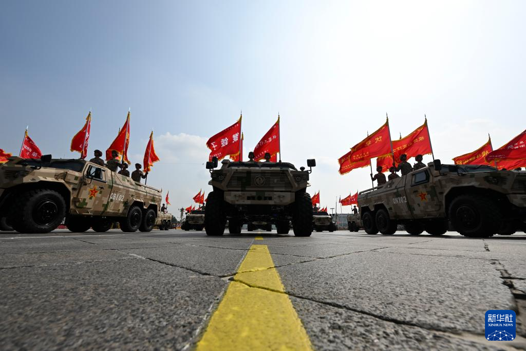 9月3日,纪念中国人民抗日战争暨世界反法西斯战争胜利80周年大会在北京隆重举行。这是战旗方队和装备方队接受检阅。