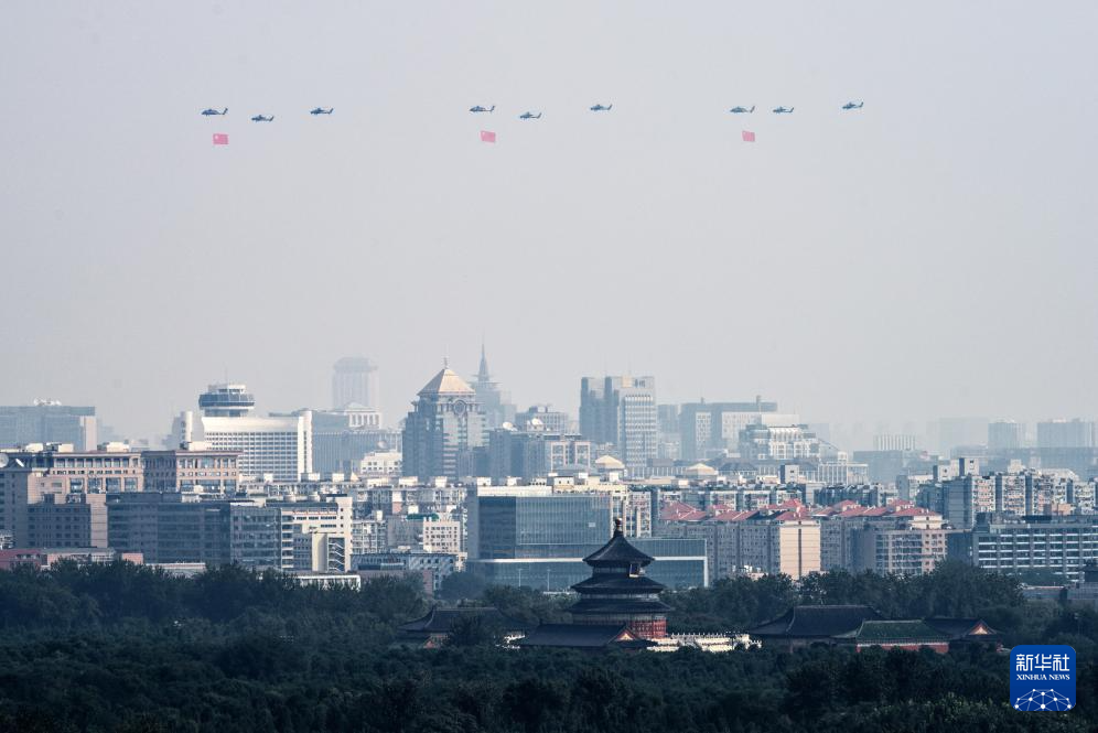 9月3日,纪念中国人民抗日战争暨世界反法西斯战争胜利80周年大会在北京隆重举行。这是空中护旗梯队接受检阅。