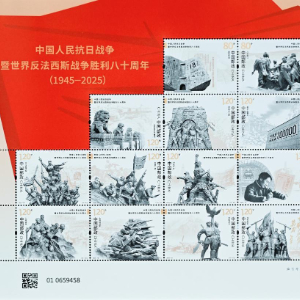 9月3日,中国邮政发行《中国人民抗日战争暨世界反法西斯战争胜利八十周年》纪念邮票1套13枚、小型张1枚,全套面值为20.8元。
