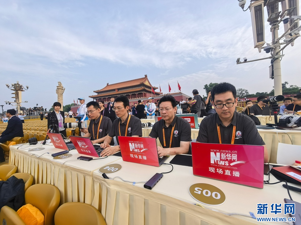 9月3日,纪念中国人民抗日战争暨世界反法西斯战争胜利80周年大会将在北京隆重举行。这是纪念大会开始前,新华网直播团队在现场进行直播准备。新华网记者 雷东瑞 摄