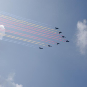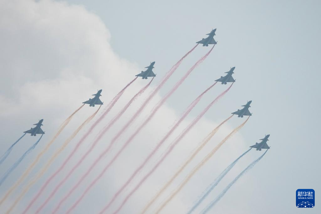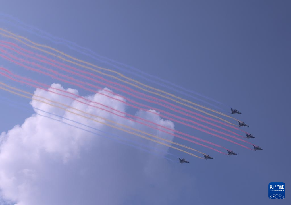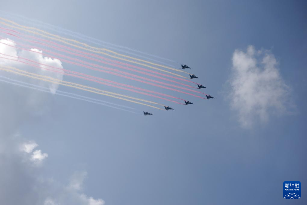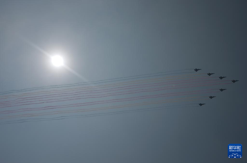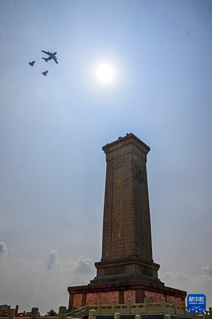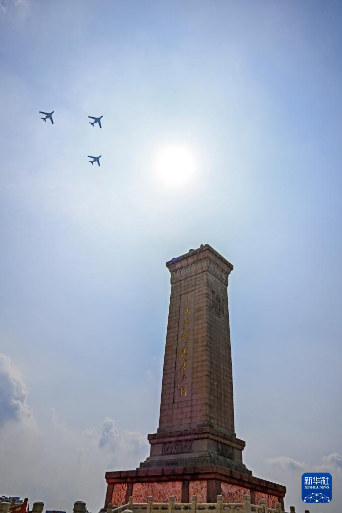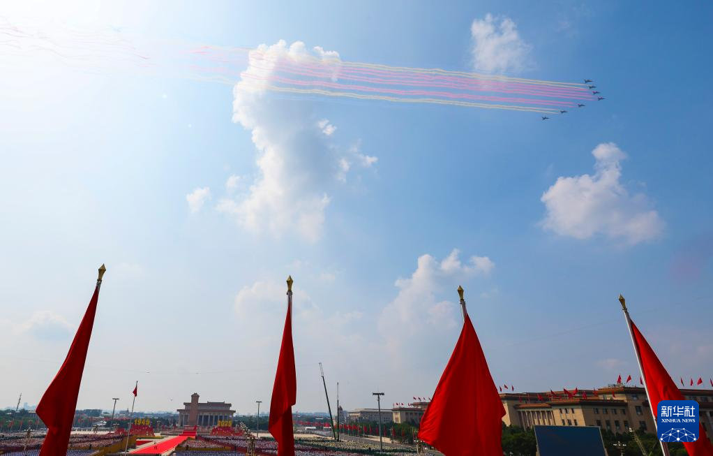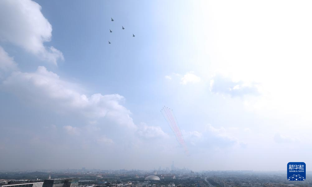9月3日,纪念中国人民抗日战争暨世界反法西斯战争胜利80周年大会在北京隆重举行。这是教练机梯队飞过天安门广场上空。