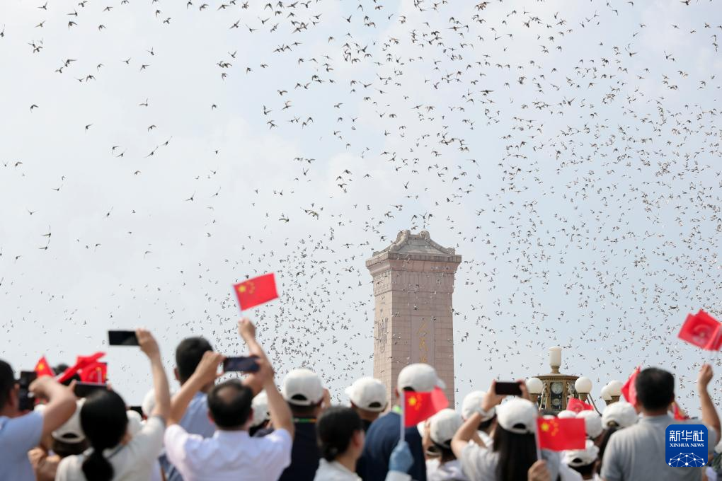 9月3日,纪念中国人民抗日战争暨世界反法西斯战争胜利80周年大会在北京隆重举行。这是纪念大会现场放飞鸽子。