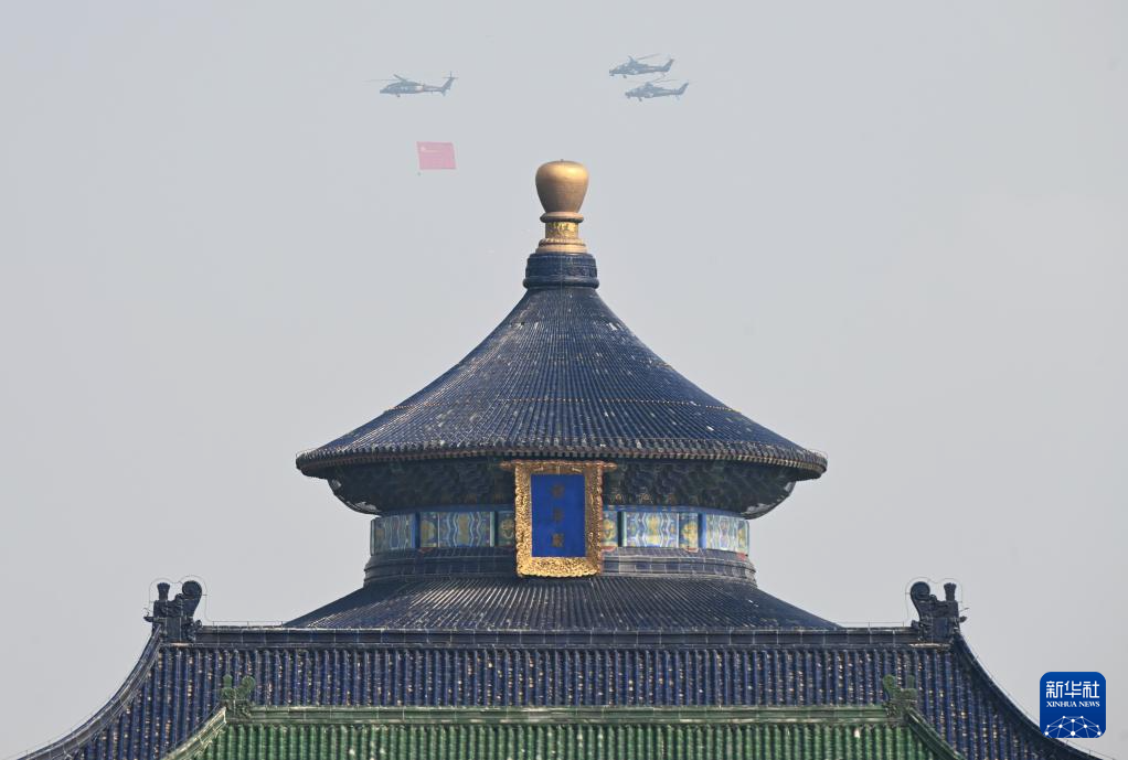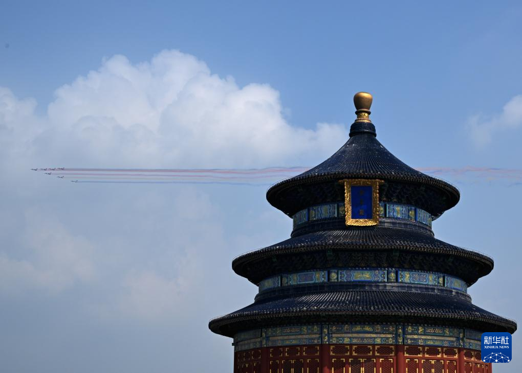 9月3日,纪念中国人民抗日战争暨世界反法西斯战争胜利80周年大会在北京隆重举行。这是在北京天坛公园拍摄的空中护旗梯队。