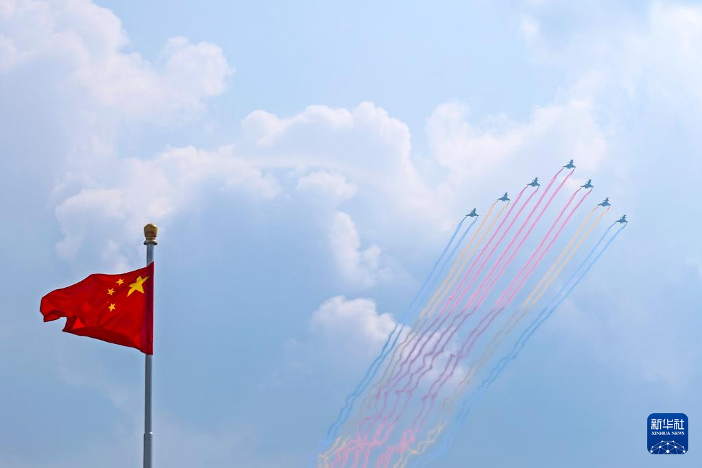 9月3日,纪念中国人民抗日战争暨世界反法西斯战争胜利80周年大会在北京隆重举行。这是空中护旗梯队通过天安门广场。
