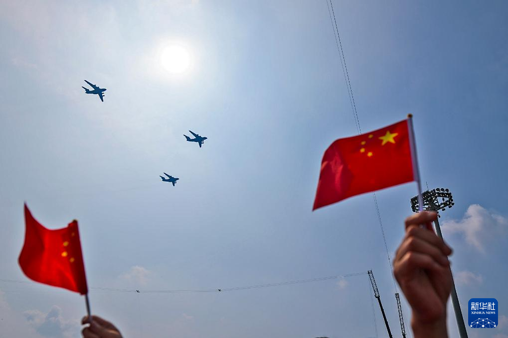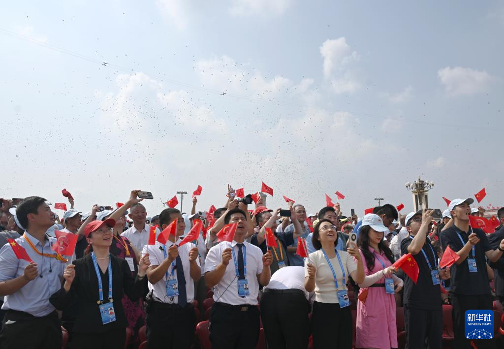 9月3日,纪念中国人民抗日战争暨世界反法西斯战争胜利80周年大会在北京隆重举行。这是观众拍摄空中护旗梯队通过天安门广场。