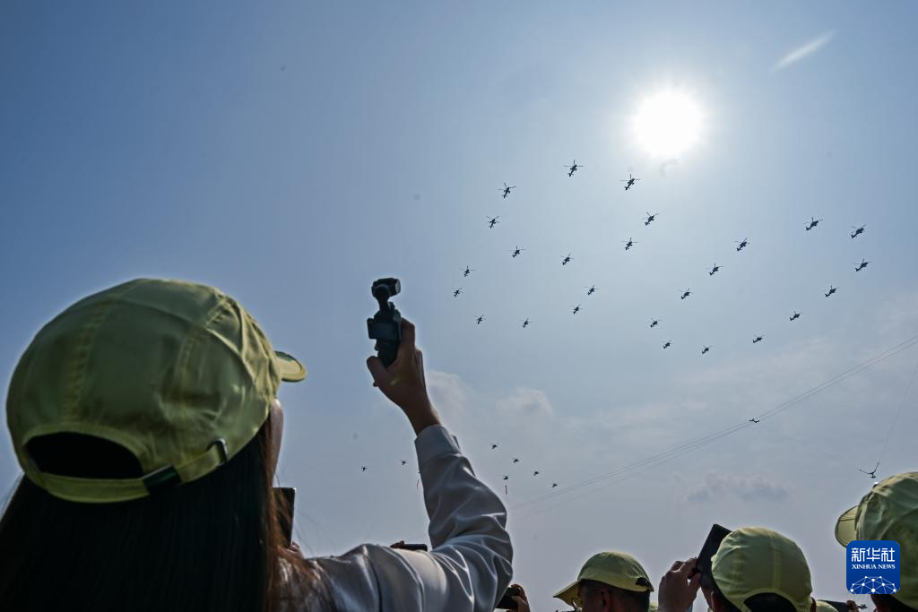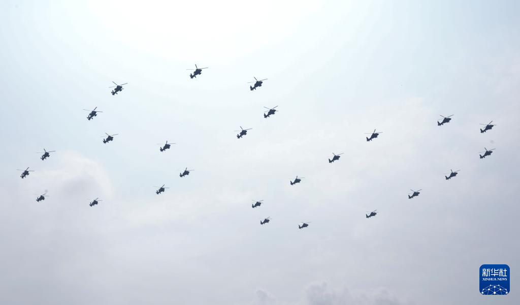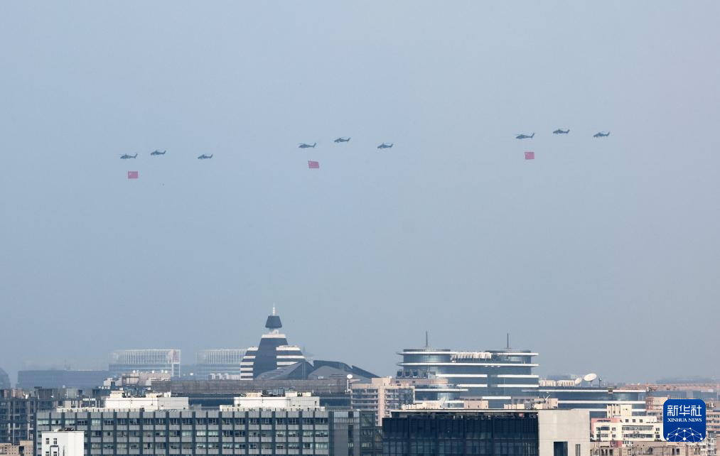 9月3日,纪念中国人民抗日战争暨世界反法西斯战争胜利80周年大会在北京隆重举行。这是空中护旗梯队通过天安门广场,26架直-19武装直升机组成“80”字样。