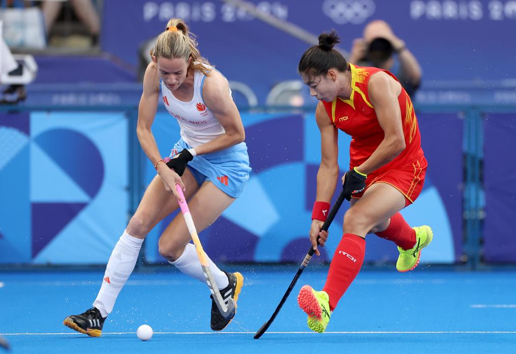 2024年8月9日,中国队球员在巴黎奥运会女子曲棍球金牌赛中与荷兰队球员拼抢。新华社记者 任鹏飞 摄