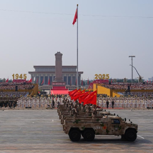 9月3日,纪念中国人民抗日战争暨世界反法西斯战争胜利80周年大会在北京隆重举行。这是空中护旗梯队。