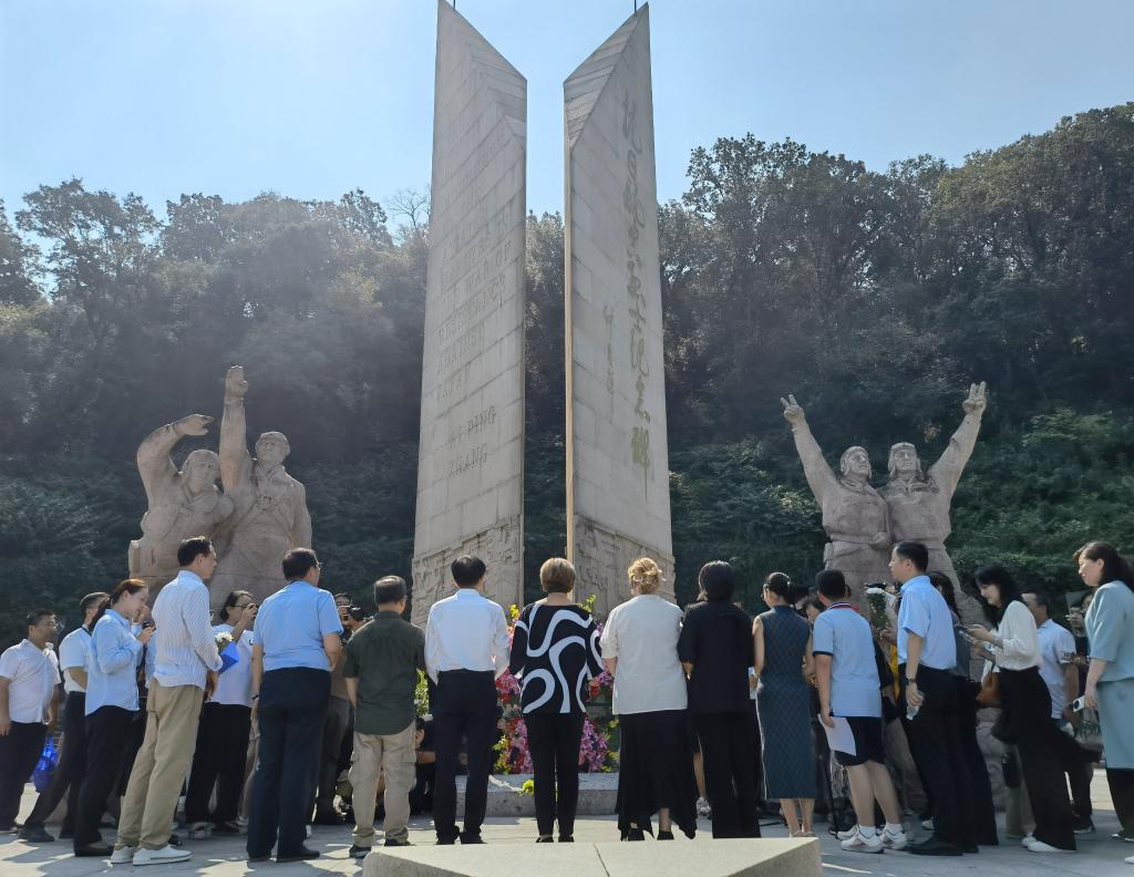 9月5日,美国“飞虎队”指挥官陈纳德将军的外孙女嘉兰惠等中外嘉宾在抗日航空烈士纪念碑前凭吊。新华社记者 邱冰清 摄