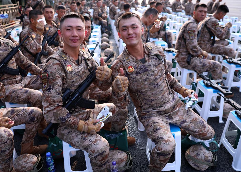 在阅兵场上,他们是整齐划一的方阵,坚不可摧。但在这里、在大会正式开始前的清晨,他们也只是一群二十出头的青年,有喜悦、有紧张、有兴奋。那一瞬间,军人和“普通人”的界限悄然模糊,那些刻板印象中冷峻威严的“铁血硬汉”,此刻却鲜活、亲切,如邻家少年。