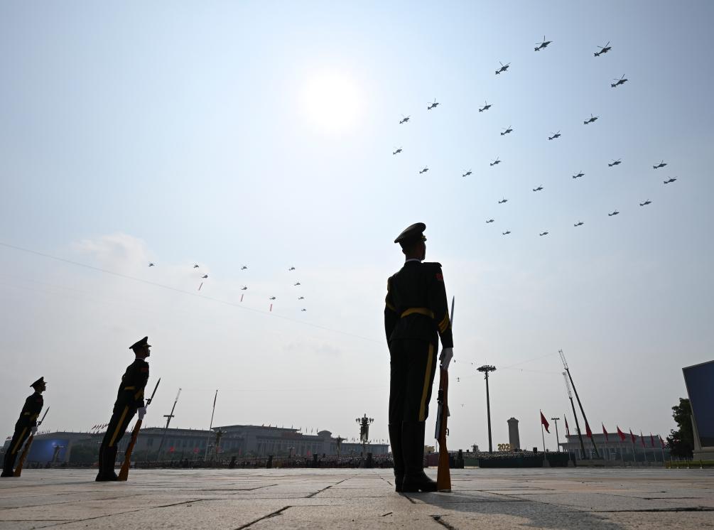 9月3日,纪念中国人民抗日战争暨世界反法西斯战争胜利80周年大会在北京隆重举行。这是空中护旗梯队飞过天安门广场上空,26架直升机汇成巨大的“80”字样。新华社记者 肖艺九 摄