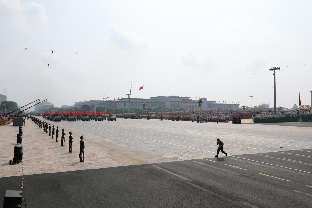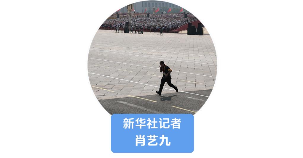 9时59分,最后一个徒步方队以整齐划一、坚定有力的步伐朝我而来,此时我的心也开始飞快地跳动,我大口呼吸,试图让自己能够稳住。方队通过后,我立刻抱起设备,数着线标,一口气冲到安全线位置,放置、调整、撤离。跑回点位后,我喘着粗气,迅速拎起另一台相机,继续拍摄,因为我知道,这样重大的历史现场,错过了就再也没有了,一定得全力以赴。