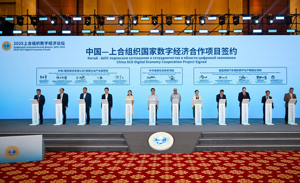 在2025上合组织数字经济论坛上,中国—上合组织国家数字经济合作项目进行签约(2025年7月11日摄)。新华社记者 赵子硕 摄