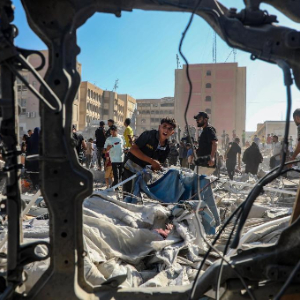 9月8日,人们在加沙城查看一座高层建筑遭以色列军队空袭后的废墟。新华社发(里泽克·阿卜杜勒贾瓦德摄)