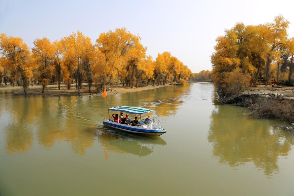 行车约17公里后,便抵达以恰阳河命名的景区终点站。恰阳河是塔里木河重要支流,也是这片胡杨林的生命之源。在此,游客可以转乘森林小火车,继续深入林区,沉浸式体验童话般的金色世界,也可以乘上小船,沿河道婉转漂流,体验“水在林中流,林在水中生”的奇妙景致。