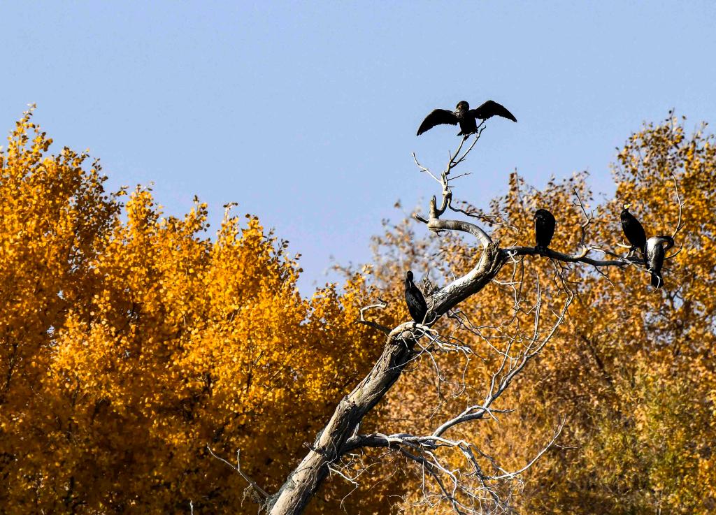 在位于新疆轮台县的一处胡杨林里,鸟儿站在胡杨枝头上。新华社记者 赵戈 摄