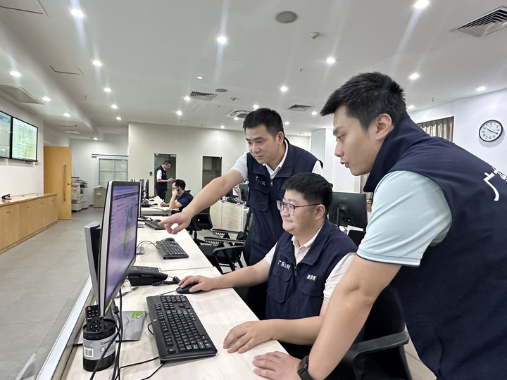 广东省水利厅防汛值班室在讨论目前台风发展和登陆路径。新华社发