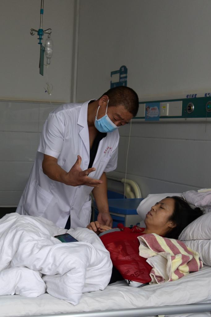 9月27日,陇西县第二人民医院骨伤科主任马宏斌向伤员询问病情。新华社记者 王朋 摄