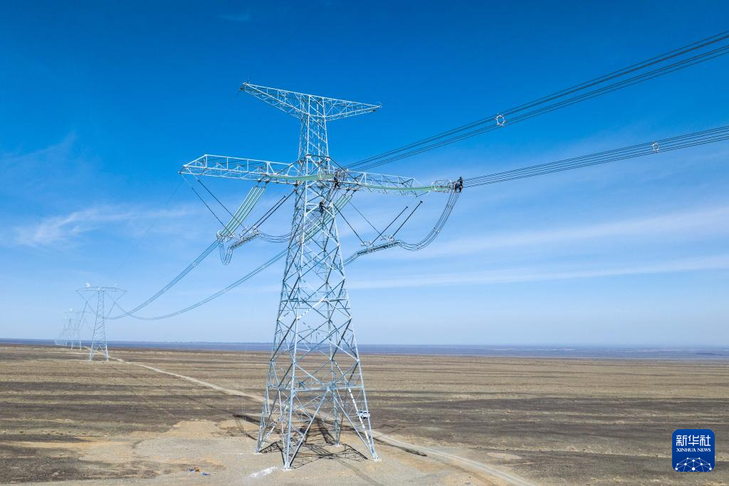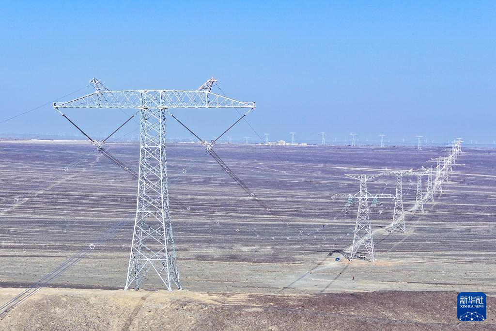 矗立在戈壁上的±800千伏哈密—重庆特高压直流输电线路工程(4月8日摄,无人机照片)。