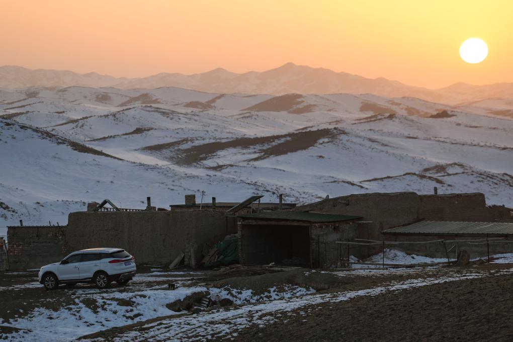 冬牧场上巴哈提家的房屋。屋旁的白色汽车是为庆祝小女儿昆树阿克考上大学所买的礼物。(2023年12月1日摄)