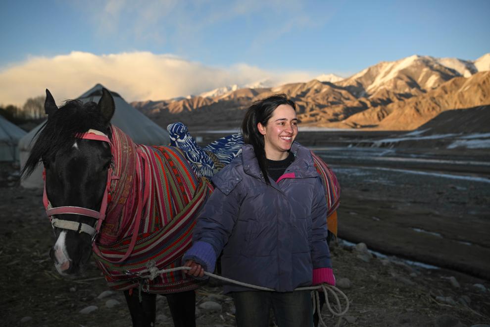 这是在新疆塔县塔什库尔干乡萨热吉勒尕村拍摄的驯马中的古丽艾萨·迪汗(2025年3月21日摄)。她是全县首位参加5000米速度赛马的女骑手。