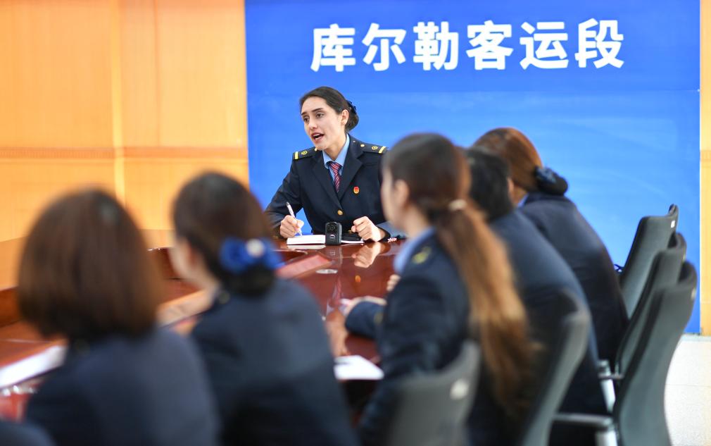 在中国铁路乌鲁木齐局集团有限公司库尔勒客运段办公楼,艾尔开牙·多力开带领同事开展值乘前的业务学习(2025年1月15日摄)。