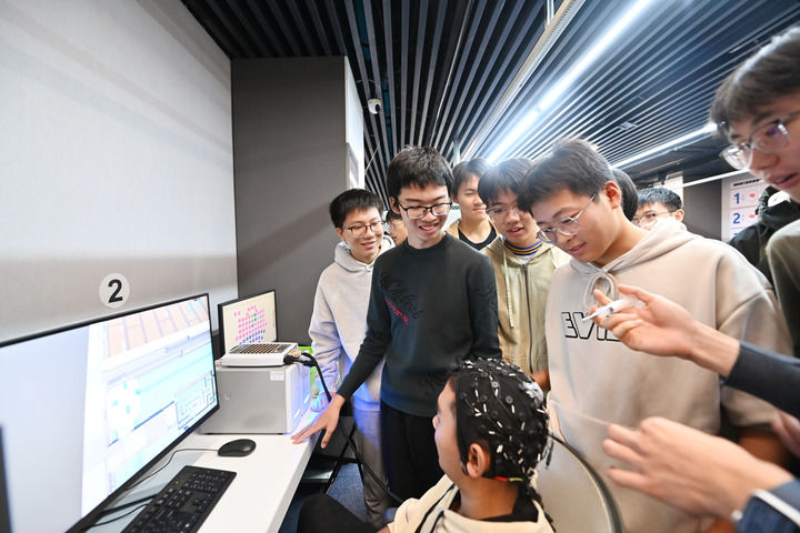 在天津大学脑机交互与人机共融海河实验室里,学生王君策头戴布满传感器的脑电帽,随着不同频率和音调的声音响起,屏幕上跳跃出经算法解码的脑电信号。他正在演示一场特殊的“听力考试”。