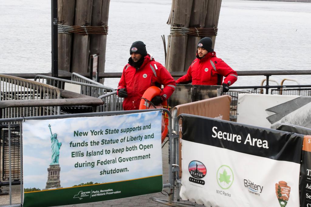 2019年1月12日,在美国纽约的去往自由女神像的码头,工人在工作,旁边的告示写着“由于联邦政府停摆,纽约州政府资助其继续开放”。新华社记者王迎摄