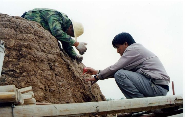 工作人员正在对西夏陵3号陵进行防风化处理。(资料图片,银川西夏陵区管理处供图)