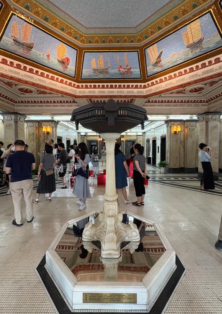 步入上海海关大楼,一楼大厅首先映入眼帘的是位于中央的青铜座灯装置,这里是20世纪20年代上海的地理原点坐标,其位置也与顶层钟楼的旗杆位置对应。屋顶的八角藻井非常精美,装饰有马赛克砖拼成的“帆影海事图”,展现了当年先进的装饰技艺。一楼展区还设置了上海海关大楼的记忆留存处,记忆之窗、记忆胶囊、记忆留声机等展览装置,留下了城市的珍贵回忆。