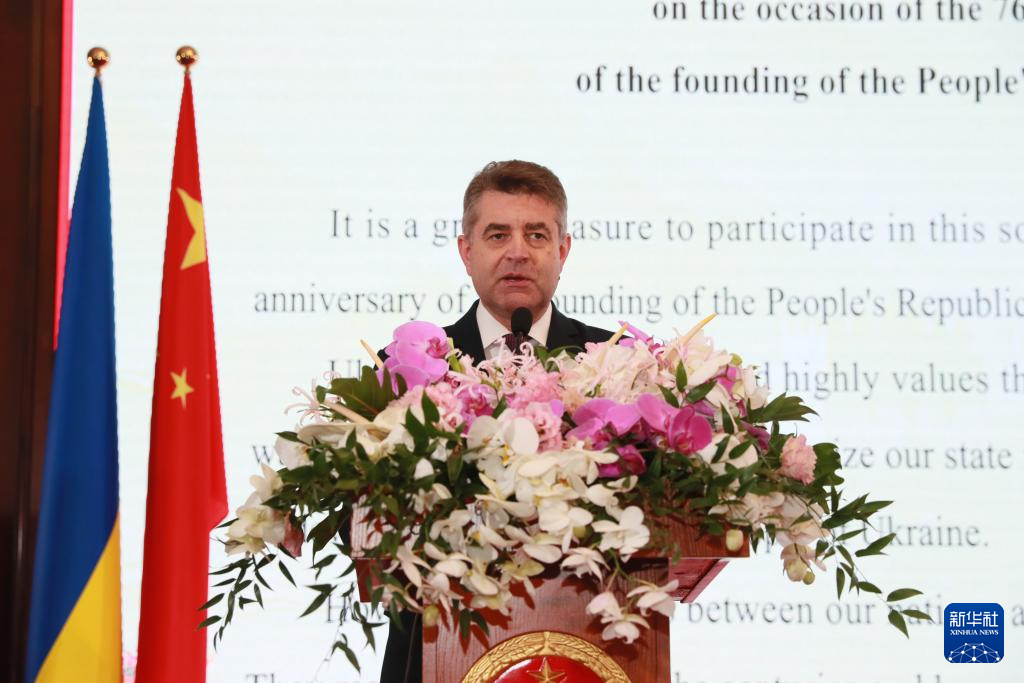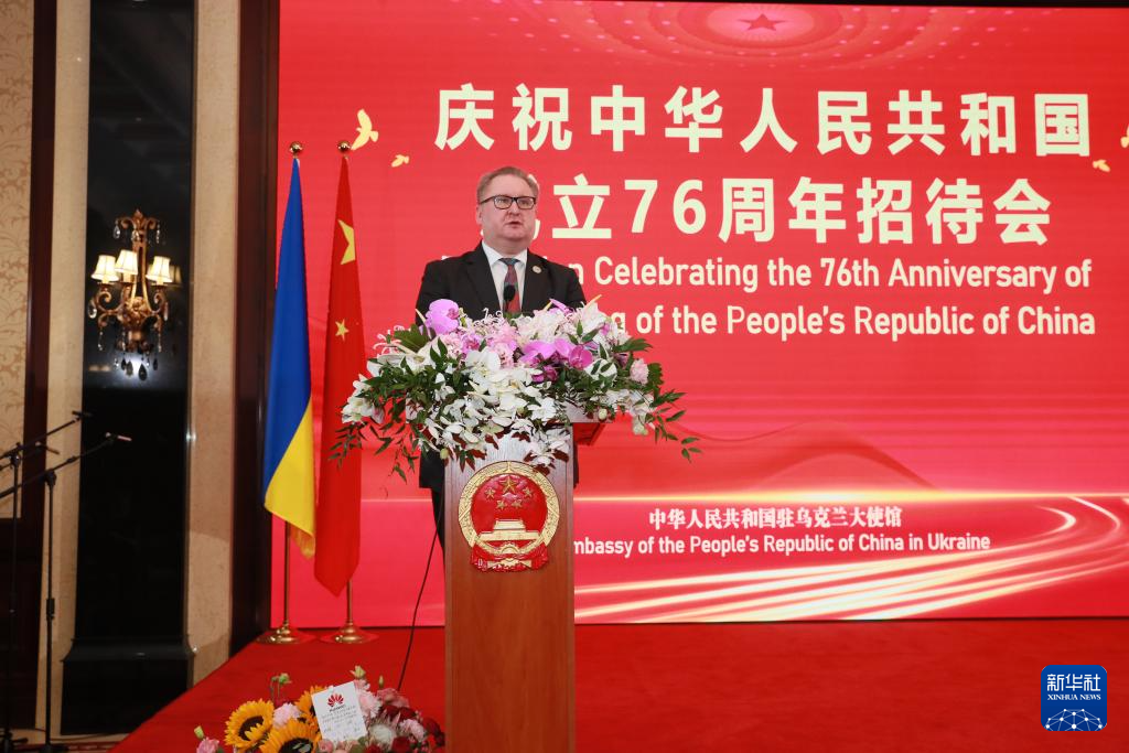 9月29日,乌克兰外交部副部长佩列彼尼斯在基辅举行的庆祝中华人民共和国成立76周年招待会上致辞。新华社记者 李东旭 摄