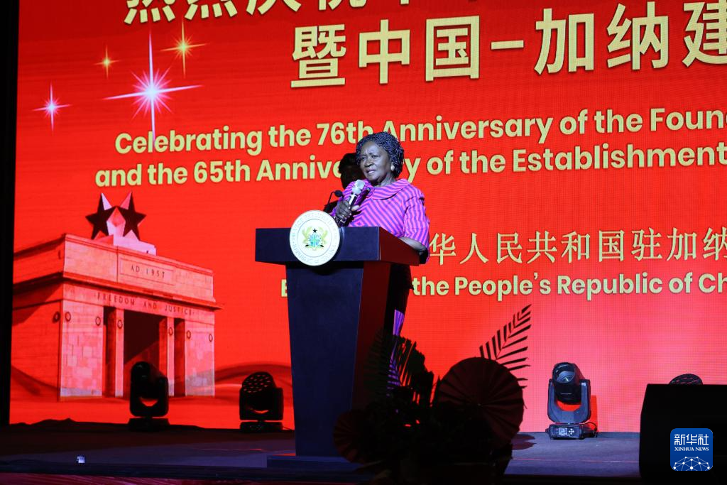 9月26日,加纳副总统简·娜娜·奥波库-阿杰曼在加纳首都阿克拉举办的庆祝中华人民共和国成立76周年暨中国-加纳建交65周年招待会上致辞。新华社发(赛特摄)