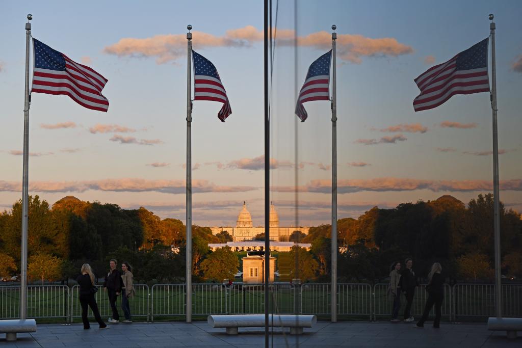 10月8日,在美国华盛顿,人们以国会大厦为背景留影。新华社记者李睿摄