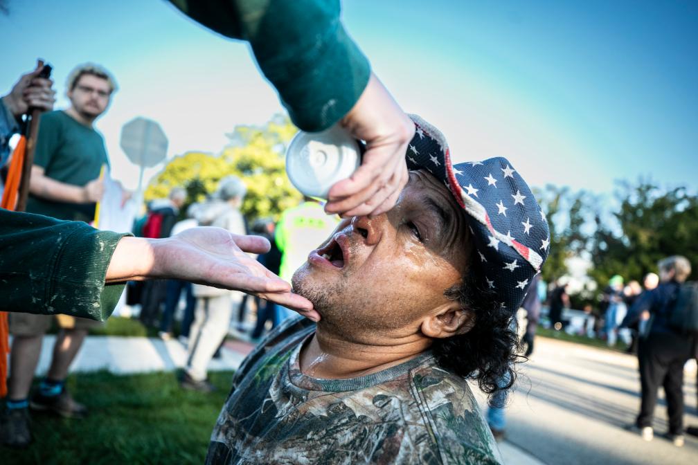 9月26日,在位于美国芝加哥西郊布罗德维尤市的移民与海关执法局办事机构外,执法人员发射的催泪弹伤及一名抗议者,同伴在为他进行紧急处置。新华社发(文森特·约翰逊摄)