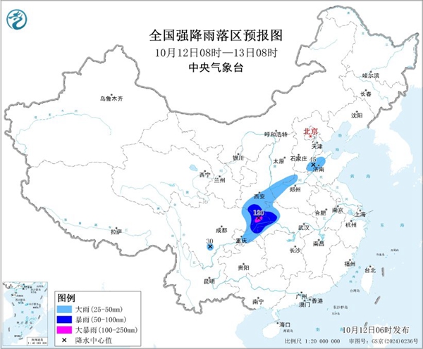 预计,10月12日08时至13日08时,陕西南部、四川东北部、重庆大部、湖北西部、山西南部、河南西部、山东西北部等地部分地区有大到暴雨,其中,重庆北部等地局地有大暴雨(100~120毫米)。上述部分地区伴有短时强降水(最大小时降雨量20~30毫米,局地可超过50毫米),局地有雷暴大风等强对流天气。