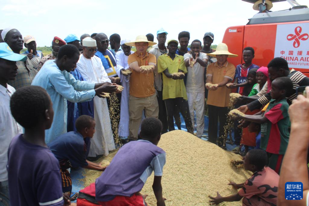 10月4日,在乍得哈杰尔-拉米斯省杜吉亚区米代金村,中国农业专家、乍方政府官员和村民共同庆祝水稻丰收。新华社发(阿诺摄)