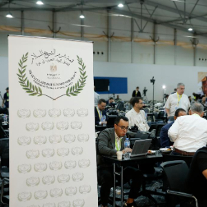 10月13日,在埃及沙姆沙伊赫,记者在沙姆沙伊赫峰会的媒体中心进行报道。