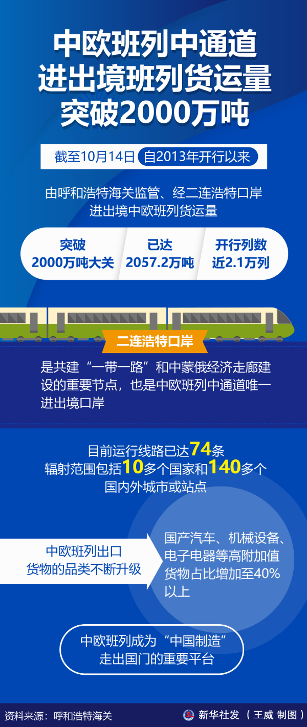 新华社呼和浩特10月15日电(记者哈丽娜)记者15日从呼和浩特海关获悉,截至10月14日,自2013年开行以来,由呼和浩特海关监管、经二连浩特口岸进出境中欧班列货运量突破2000万吨大关,已达2057.2万吨,开行列数近2.1万列。