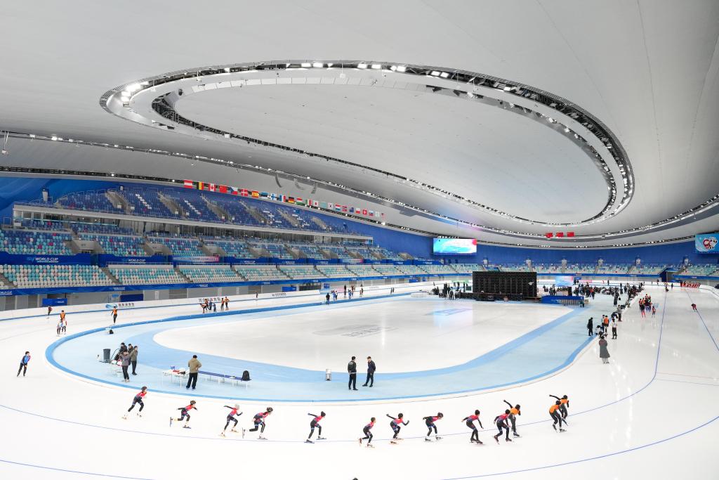 2024年11月23日,在国家速滑馆,参加2024年京津冀青少年速度滑冰邀请赛的小选手们在赛前热身。新华社记者 鞠焕宗 摄