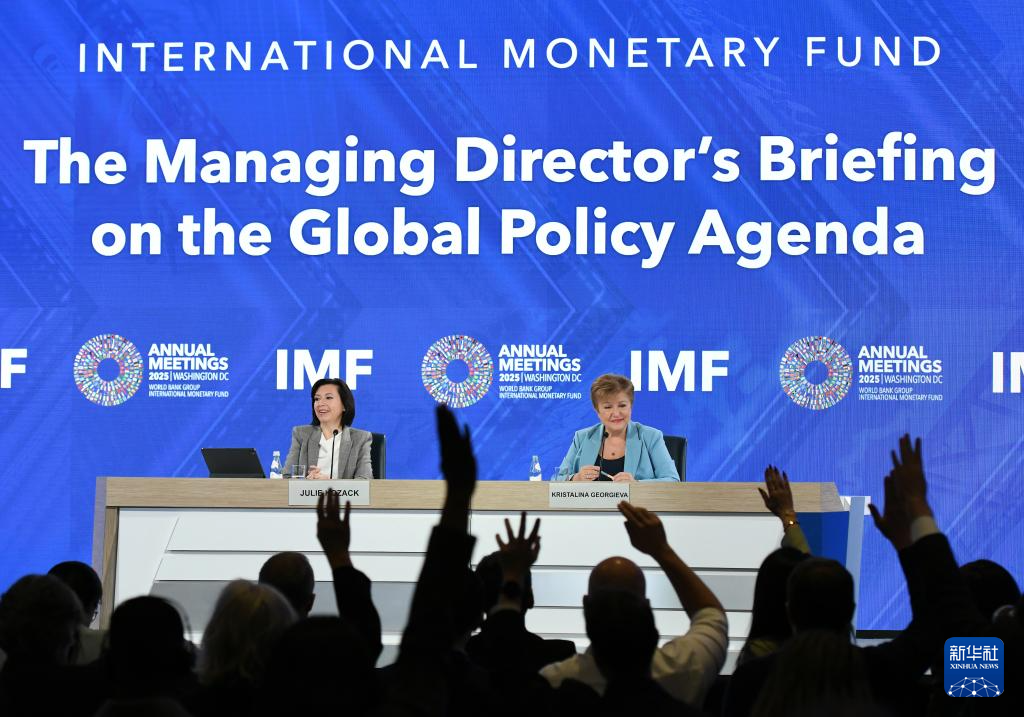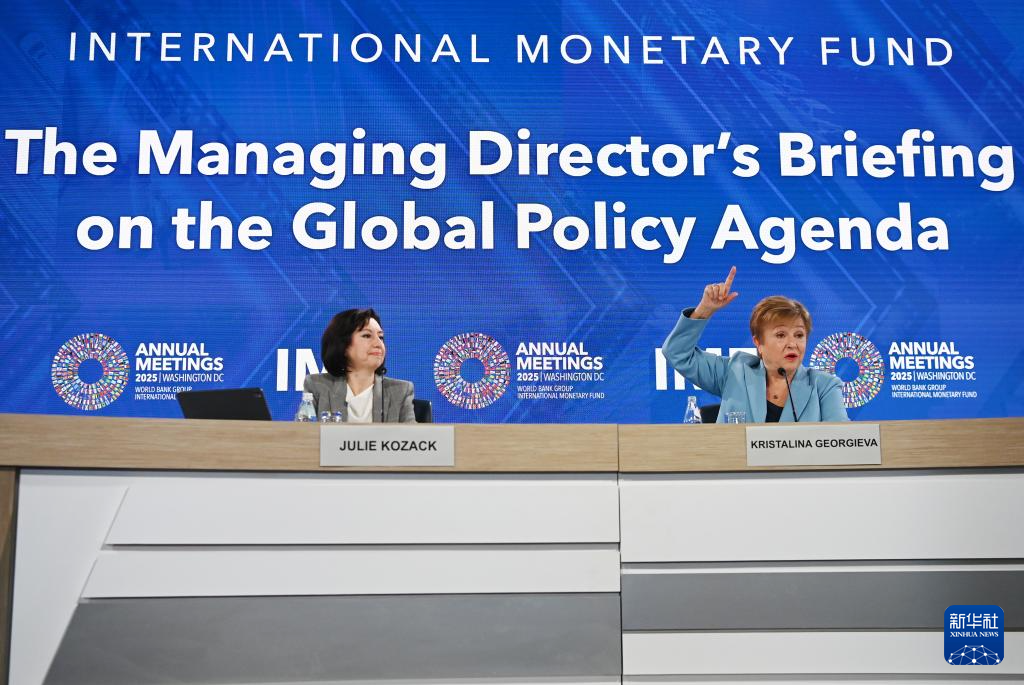 10月16日,在美国华盛顿,国际货币基金组织(IMF)总裁格奥尔基耶娃(右)在新闻发布会上讲话。新华社记者 李睿 摄