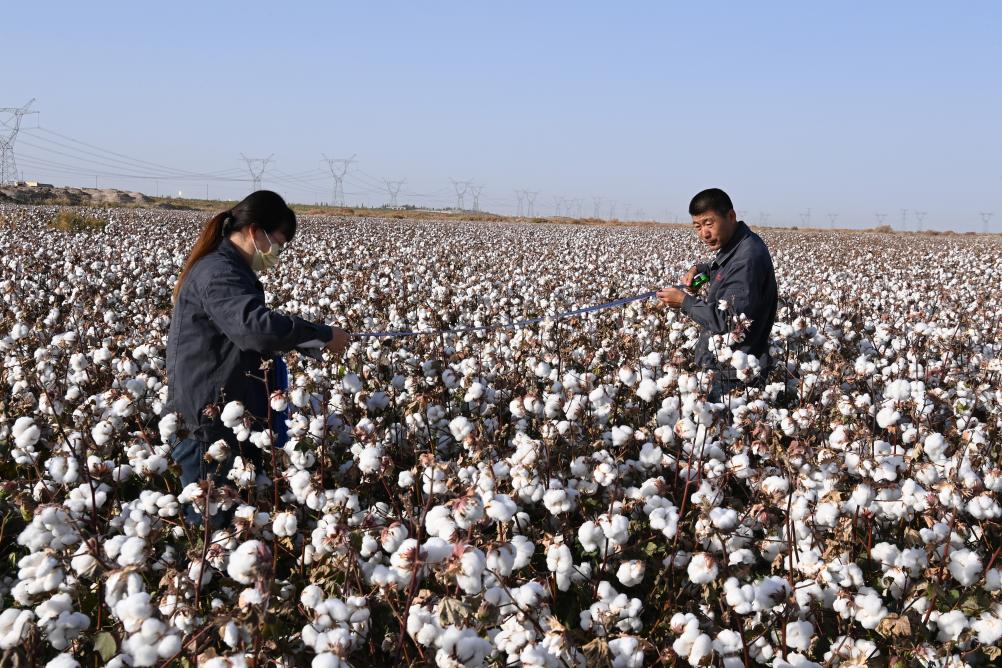 10月15日,敦煌市农业技术推广中心工作人员在棉田中测产。新华社记者 范培珅 摄