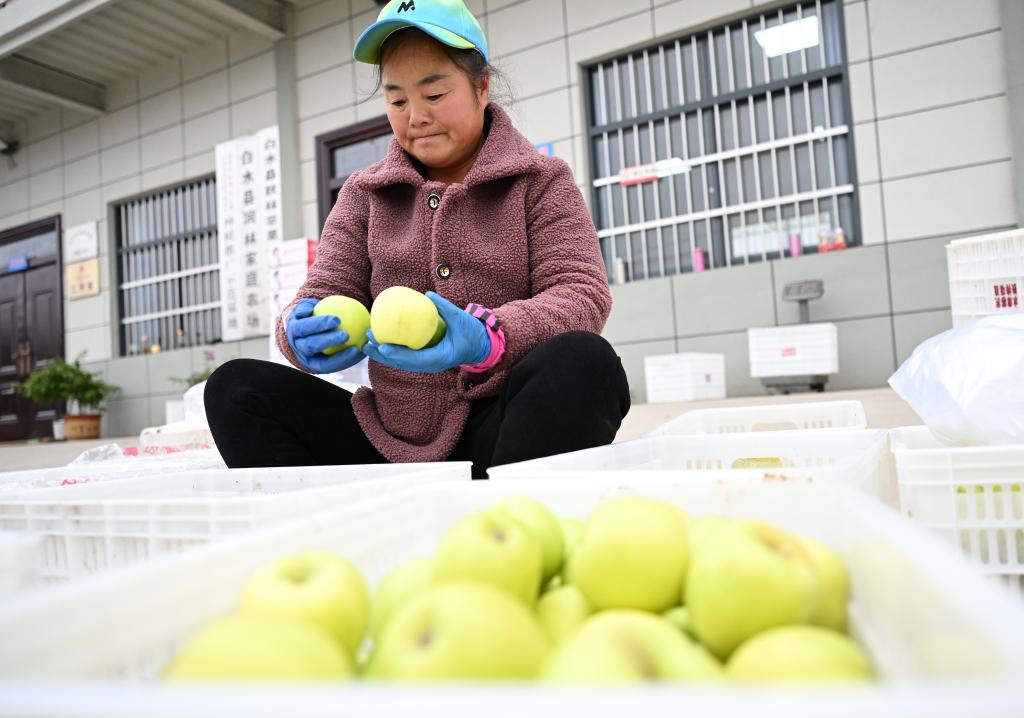 10月18日,在秋林苹果专业合作社,工人王英英分拣刚采摘的“瑞雪”苹果。新华社记者李一博摄