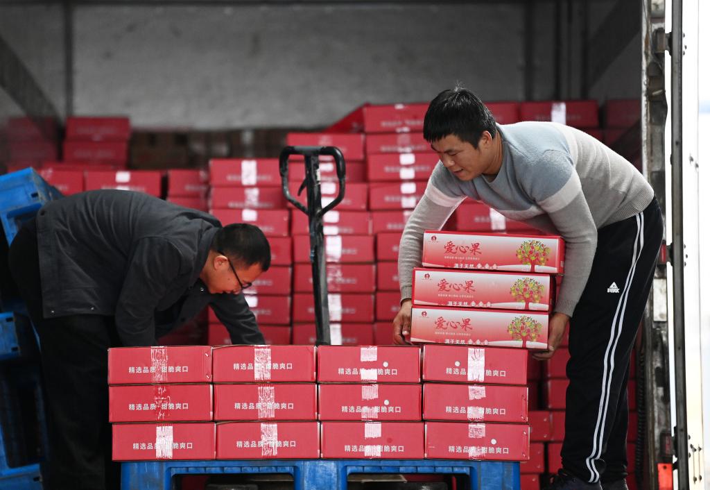 10月18日,在渭南市白水县盛隆果业,工人将苹果装车。新华社记者李一博摄