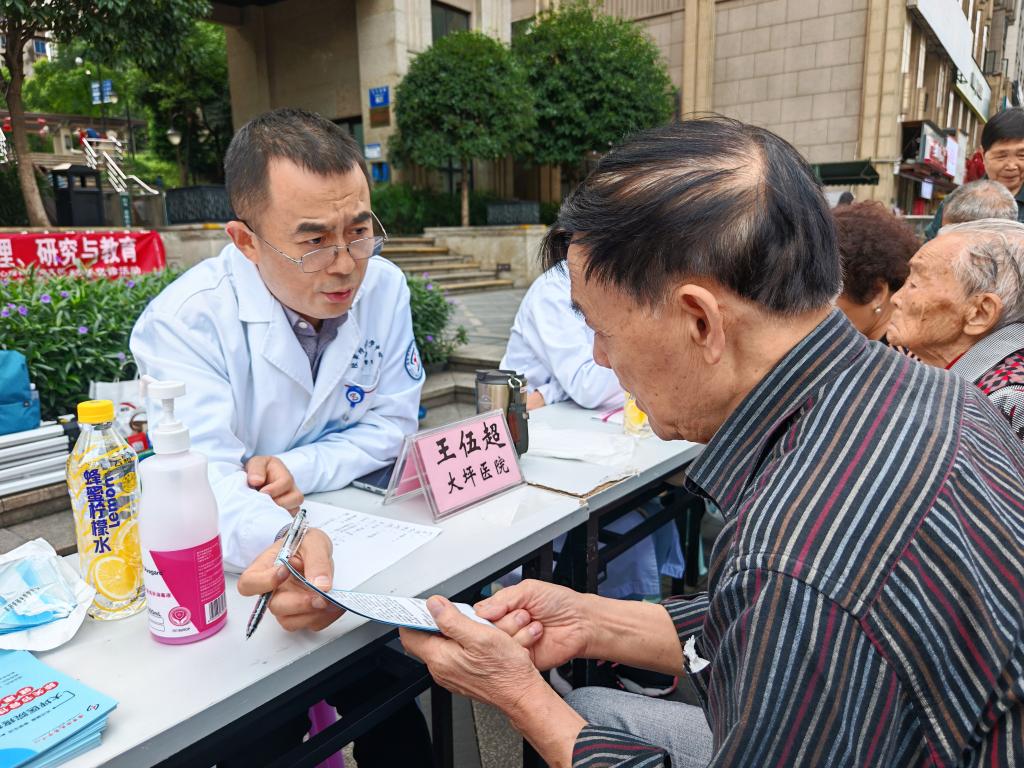 陆军军医大学陆军特色医学中心疼痛科主任王伍超在近日举行的义诊活动中。新华社发