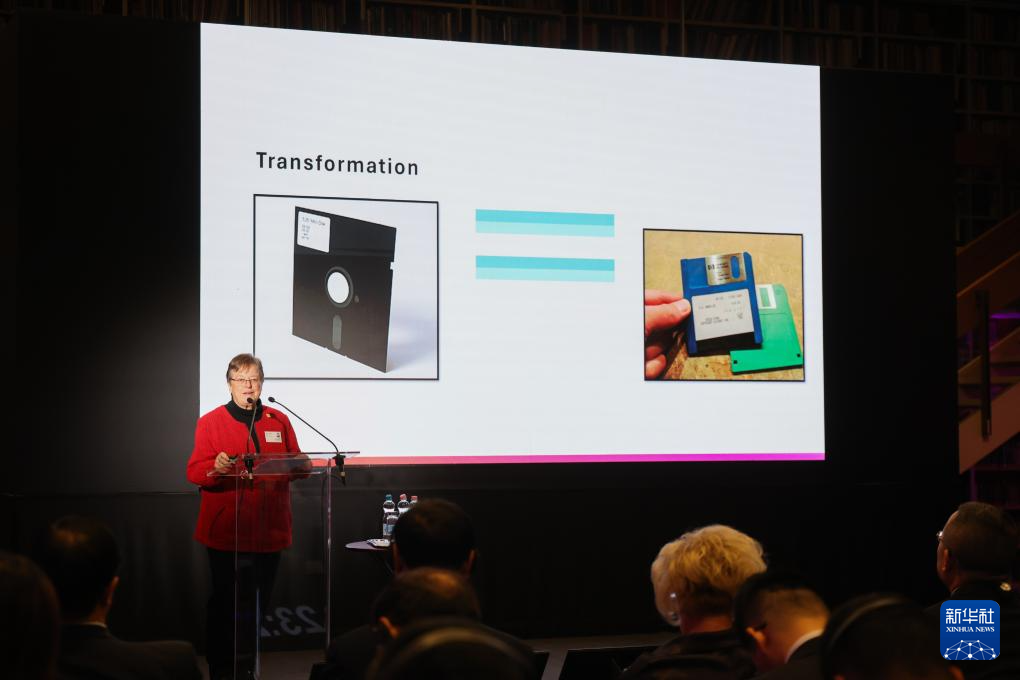 10月20日,在匈牙利首都布达佩斯,国际图书馆协会和机构联合会副秘书长海伦·曼德尔在论坛上发表演讲。新华社发(弗尔季·奥蒂洛摄)